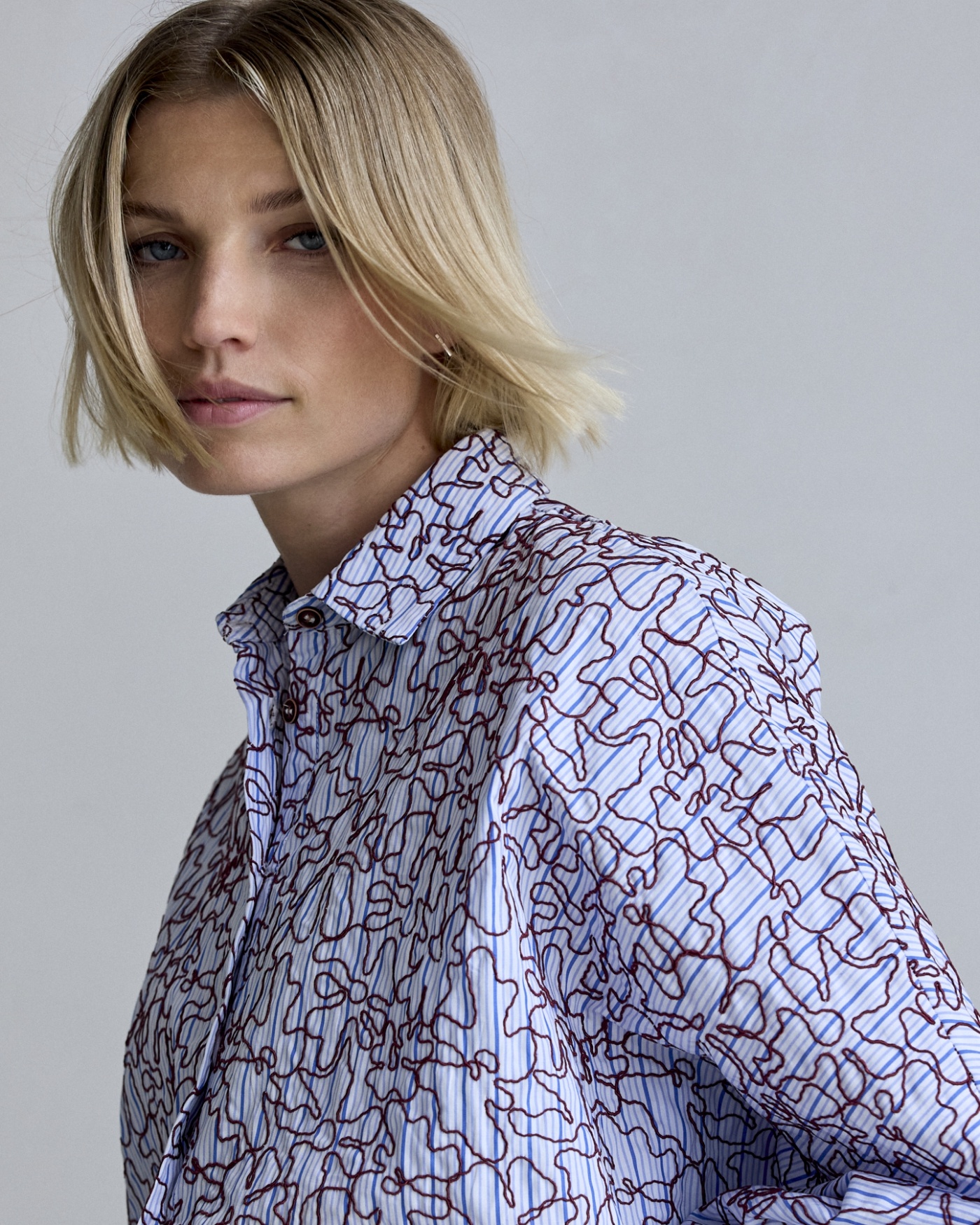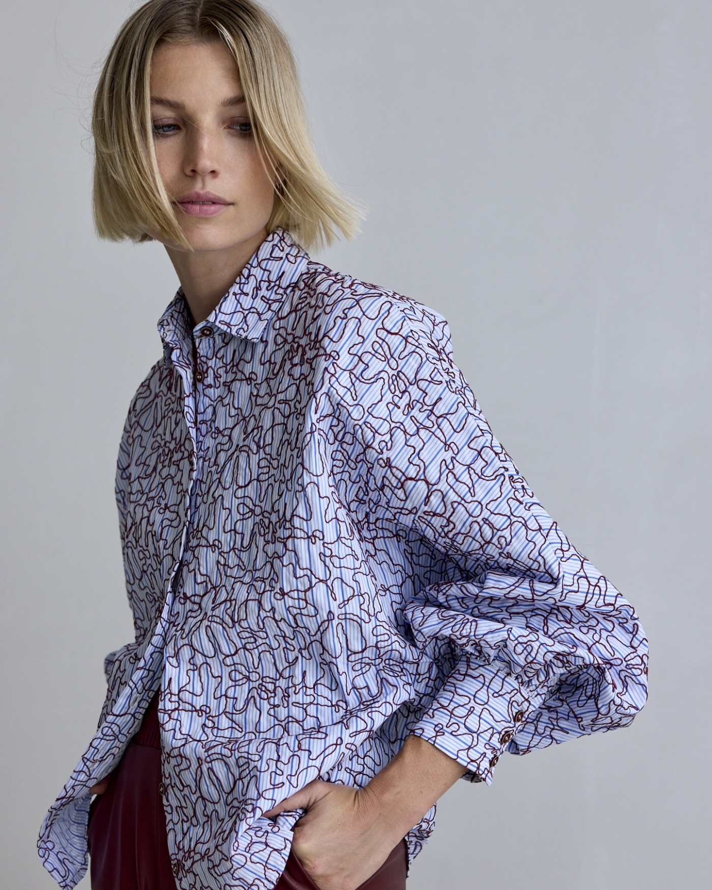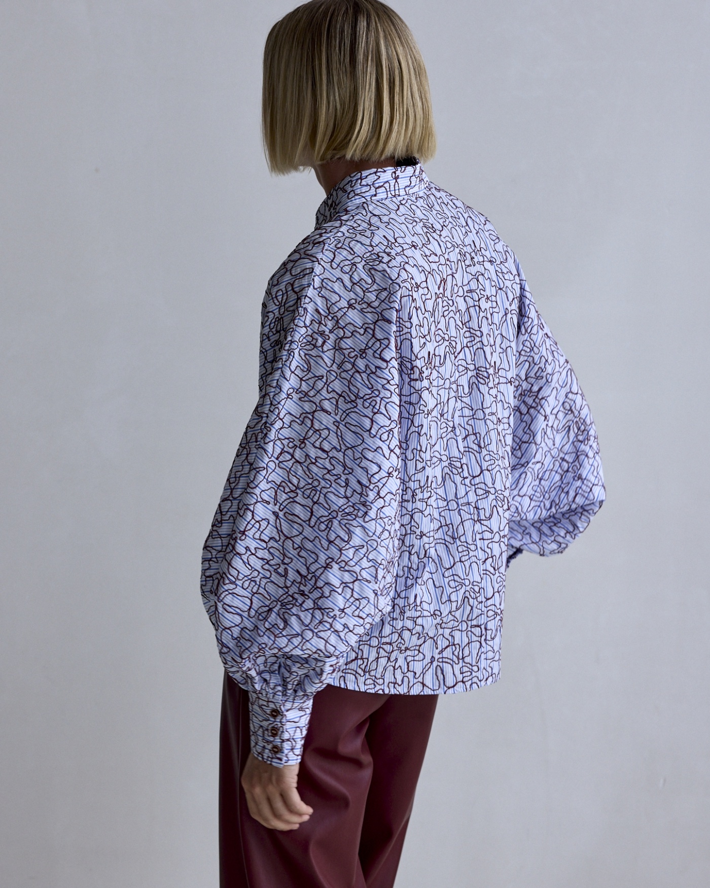 Een katoenen gestreepte blouse met een bordeauxrode draad er op geborduurd. De ballon mouwen met de brede manchetten geven deze blouse een bijzondere uitstraling. Heel tof om de blouse te combineren met een vegan leather broek.